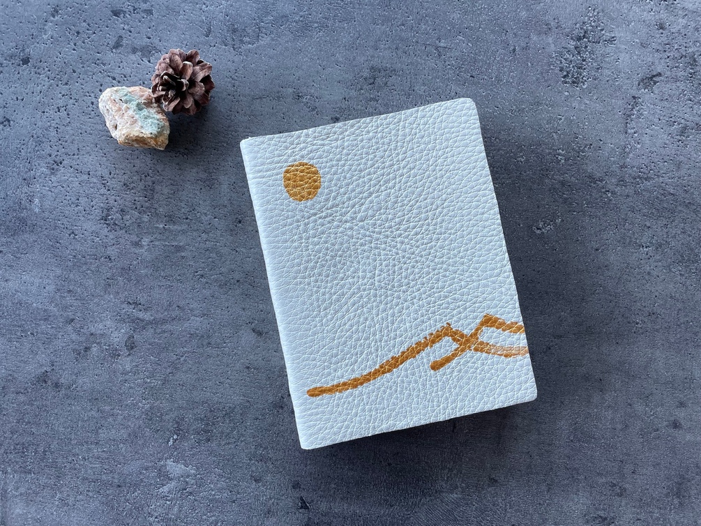 There's no way you can hold this journal and not feel a sense of calm :) Bound in lush white full grain leather with a minimal scene hand painted on the cover, the journal is super nice to touch and so peaceful to look at. The journal is filled with 144 pages of Strathmore acid free, line free paper, and measures 4.5 inches x 6 inches. Highly recommended for a zen start to your mornings!