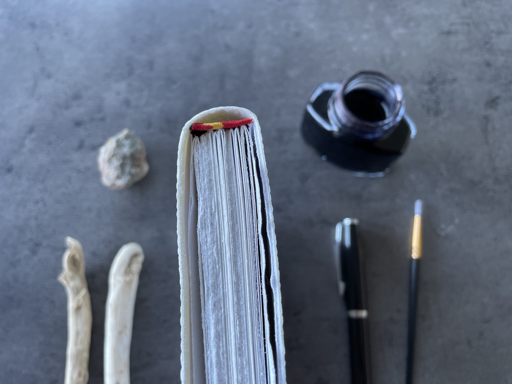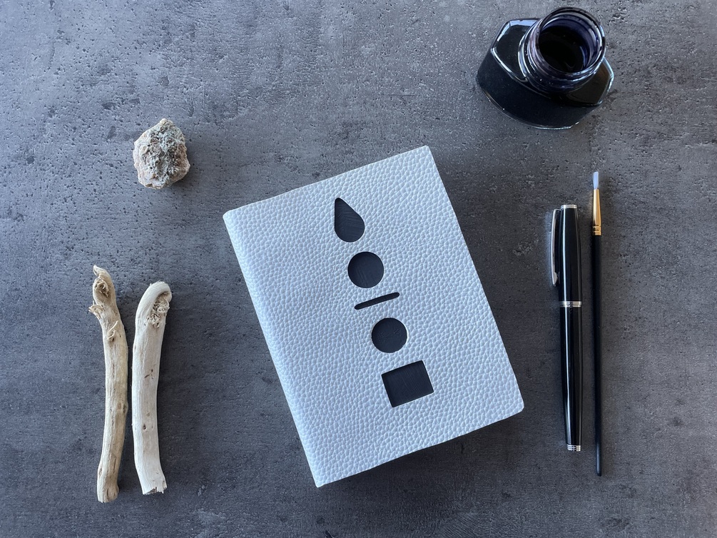 This is a super unique journal! It almost looks like a modern art painting. It's bound in white faux leather, with geometric shapes hand painted with black paint. The journal has 160 pages of acid free, hand torn sketch paper, and measures 4.5 inches by 6 inches. The journal is super snug to hold, and the paper is beautiful to write/paint/draw or just scribble on. I personally love writing on this paper with a fountain pen - it makes that lovely scritchy-scratchy sound! :)